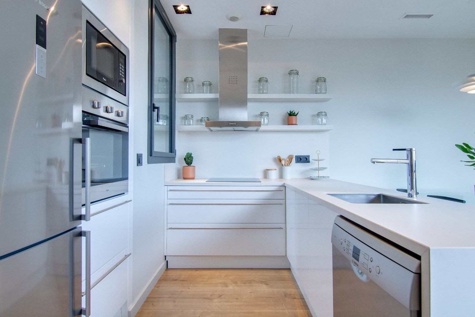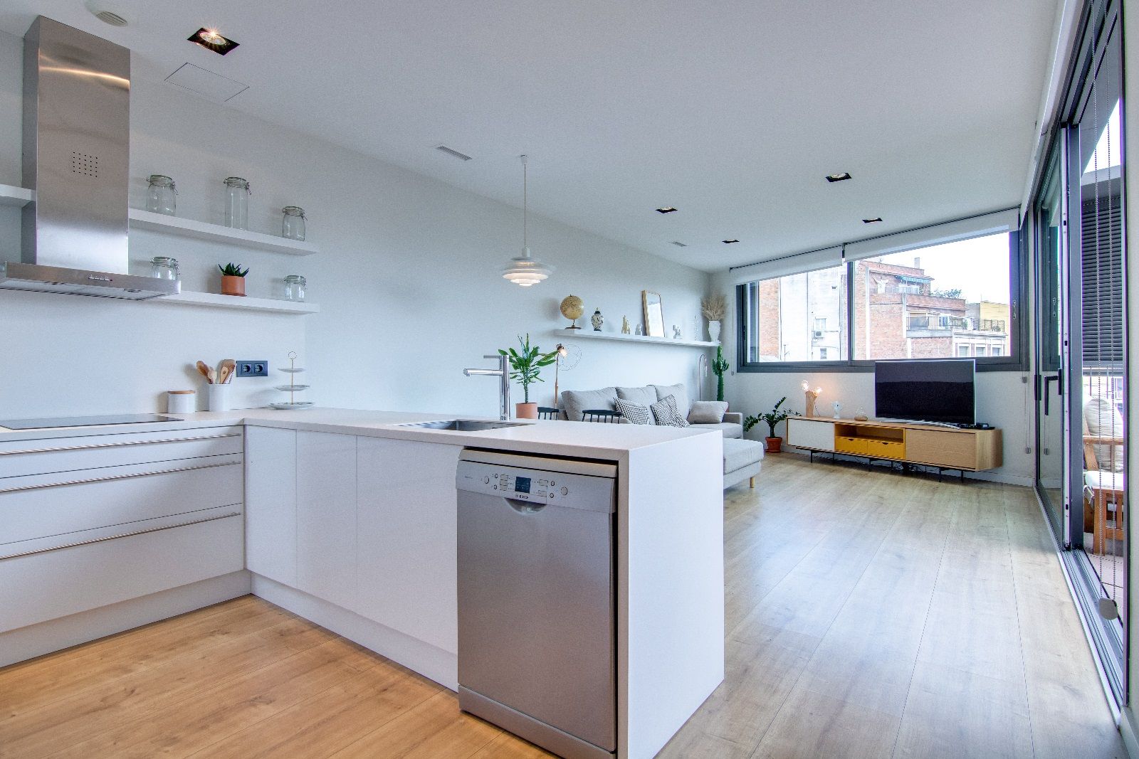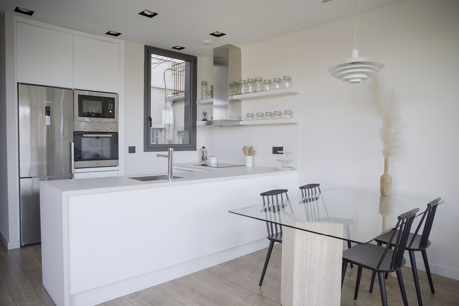 L'àrea social es compon d'un ampli espai ple de llum i d'encant, format per la cuina oberta i equipada amb tots els electrodomèstics de les millors marques i el variat parament de cuina. El pis compta també amb safareig exterior, organitzat per als elements de neteja i utilitaris de la casa. La zona de menjador i *living està envoltada de finestrals que deixen passar la llum, faciliten la ventilació i permeten unes vistes privilegiades. La terrassa a nivell funciona com una extensió de l'espai social i des d'on s'accedeix a l'impressionant solàrium de la planta superior.