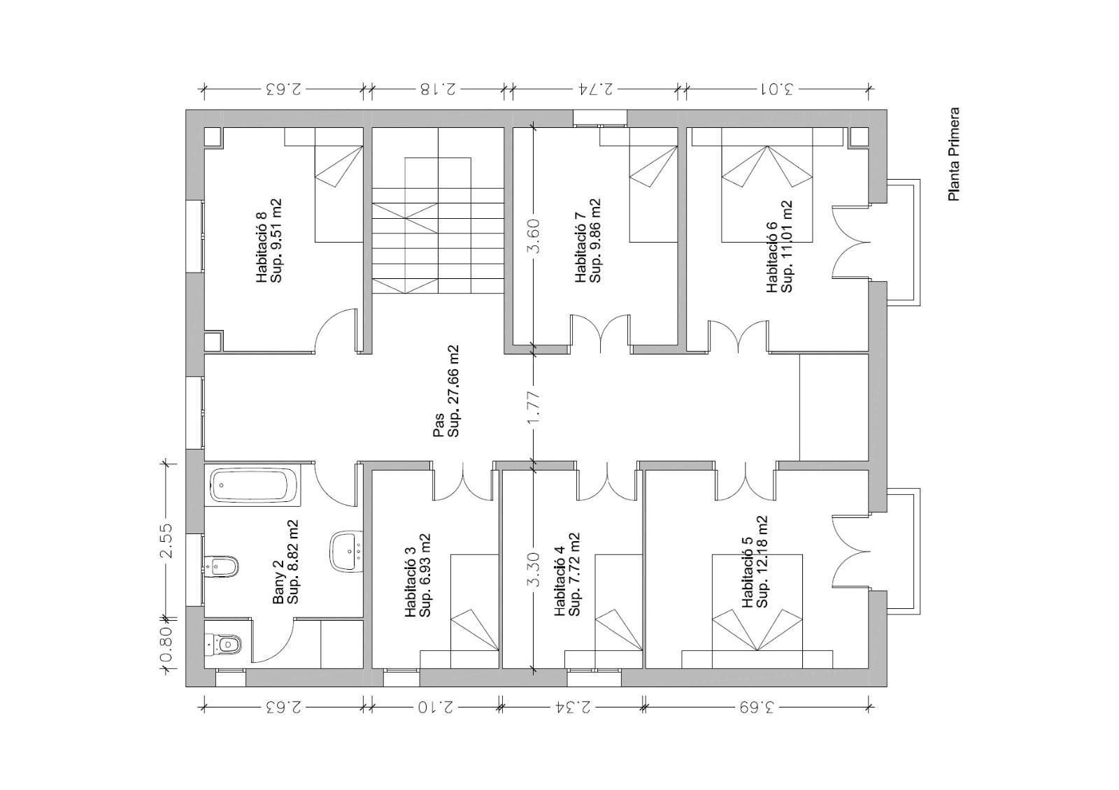 • Primera planta: zona de noche con varias habitaciones y baños (a reformar o redistribuir según proyecto)