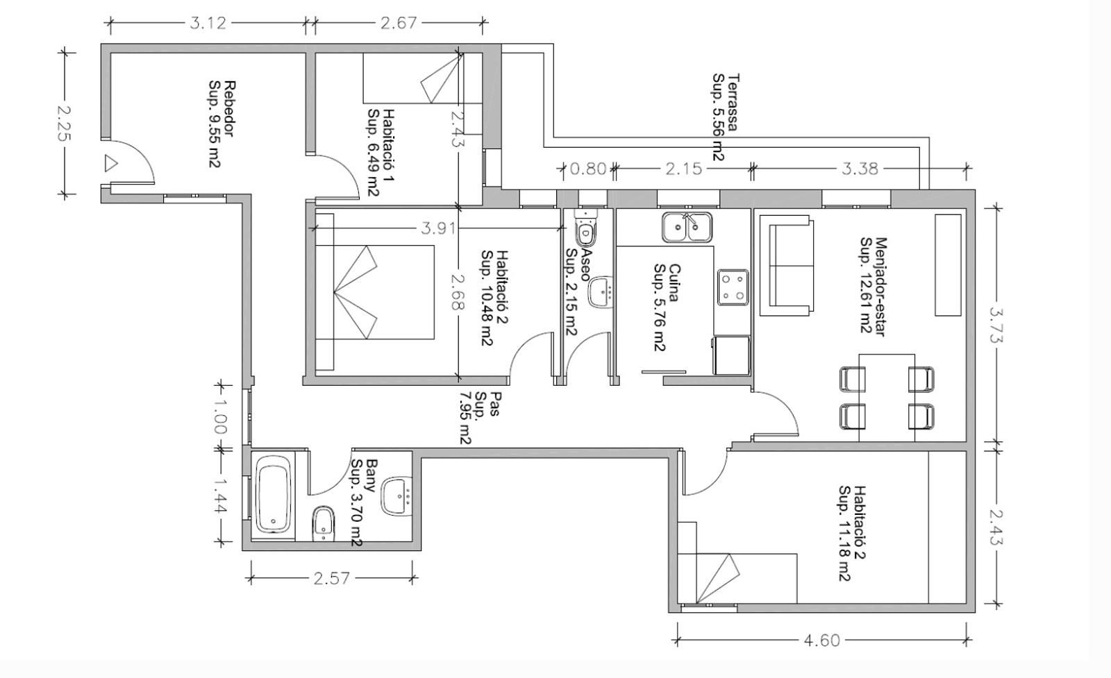 La distribución interior consta de un recibidor, tres dormitorios, un cuarto de baño completo y un aseo de cortesía, el salón-comedor, una cocina independiente con posibilidad de ser incorporada al salón, y el balcón que recorre gran parte del lateral de la vivienda.
